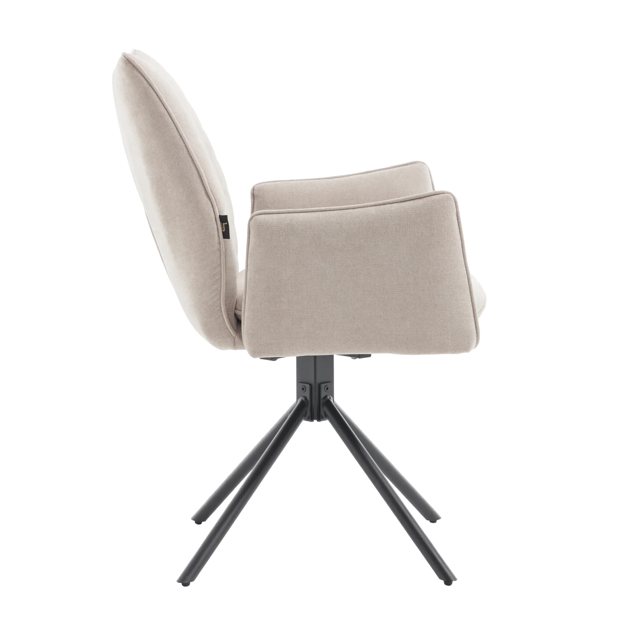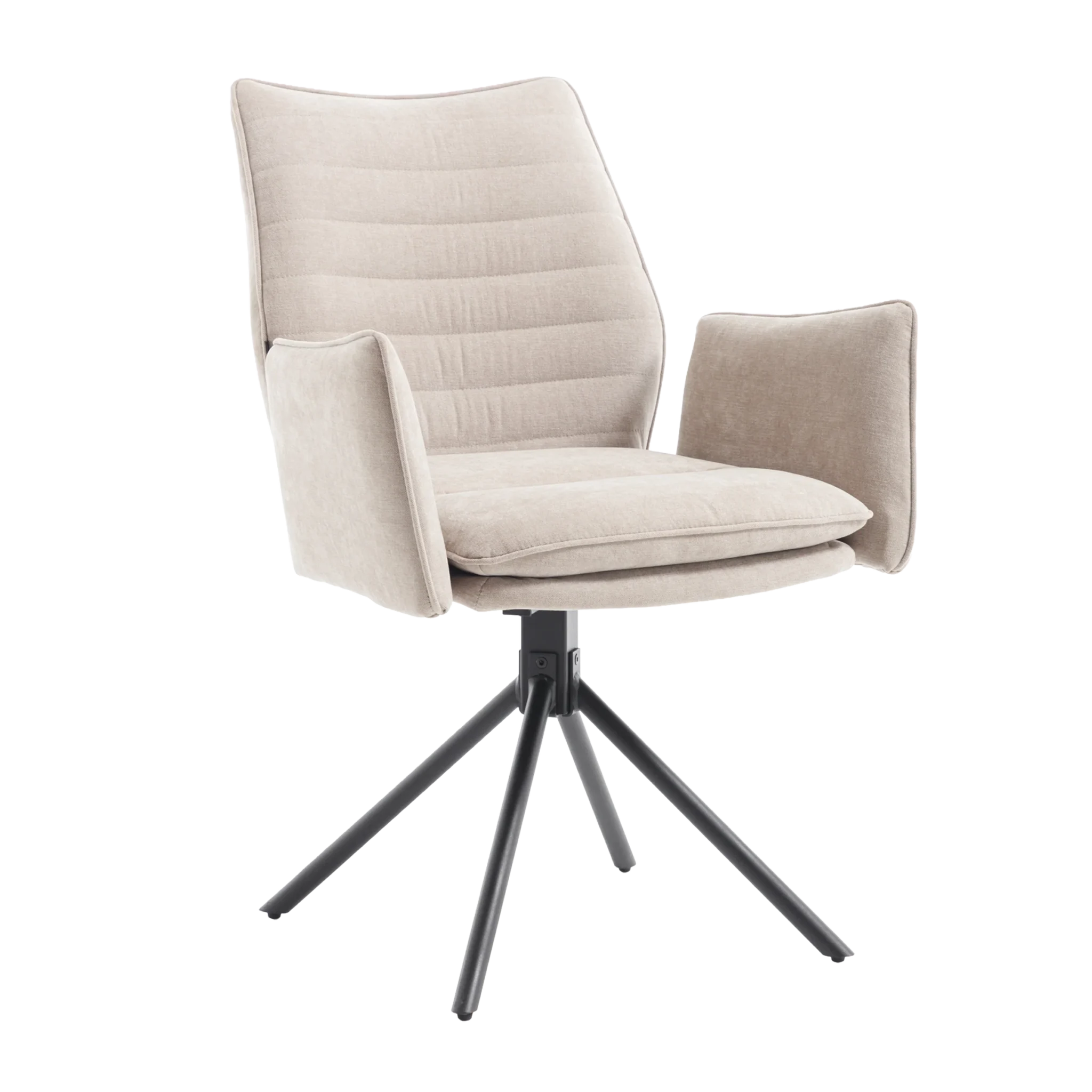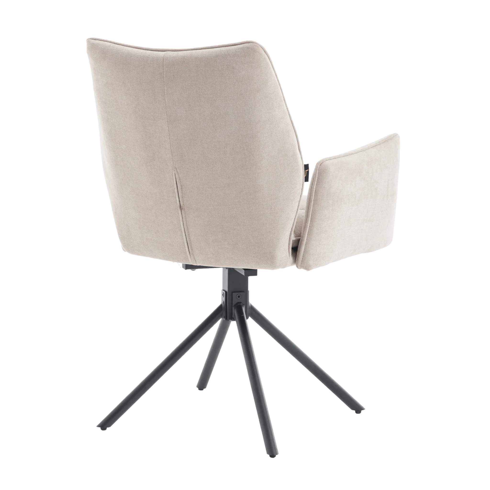 Tim is een elegante eetkamerstoel verkrijgbaar in twee luxe stoffen. De subtiele ruimte tussen rug en armleuningen zorgt voor een speels én stijlvol effect. Dankzij de 180° draaibare zitting met automatisch terugdraaisysteem draait de stoel altijd netjes terug zodra je opstaat. De stoel is verkrijgbaar in zes stijlvolle kleuren, zodat je eenvoudig een combinatie kiest die naadloos aansluit bij jouw interieur. Het stevige, gepoedercoate onderstel zorgt voor een moderne uitstraling en extra duurzaamheid.
