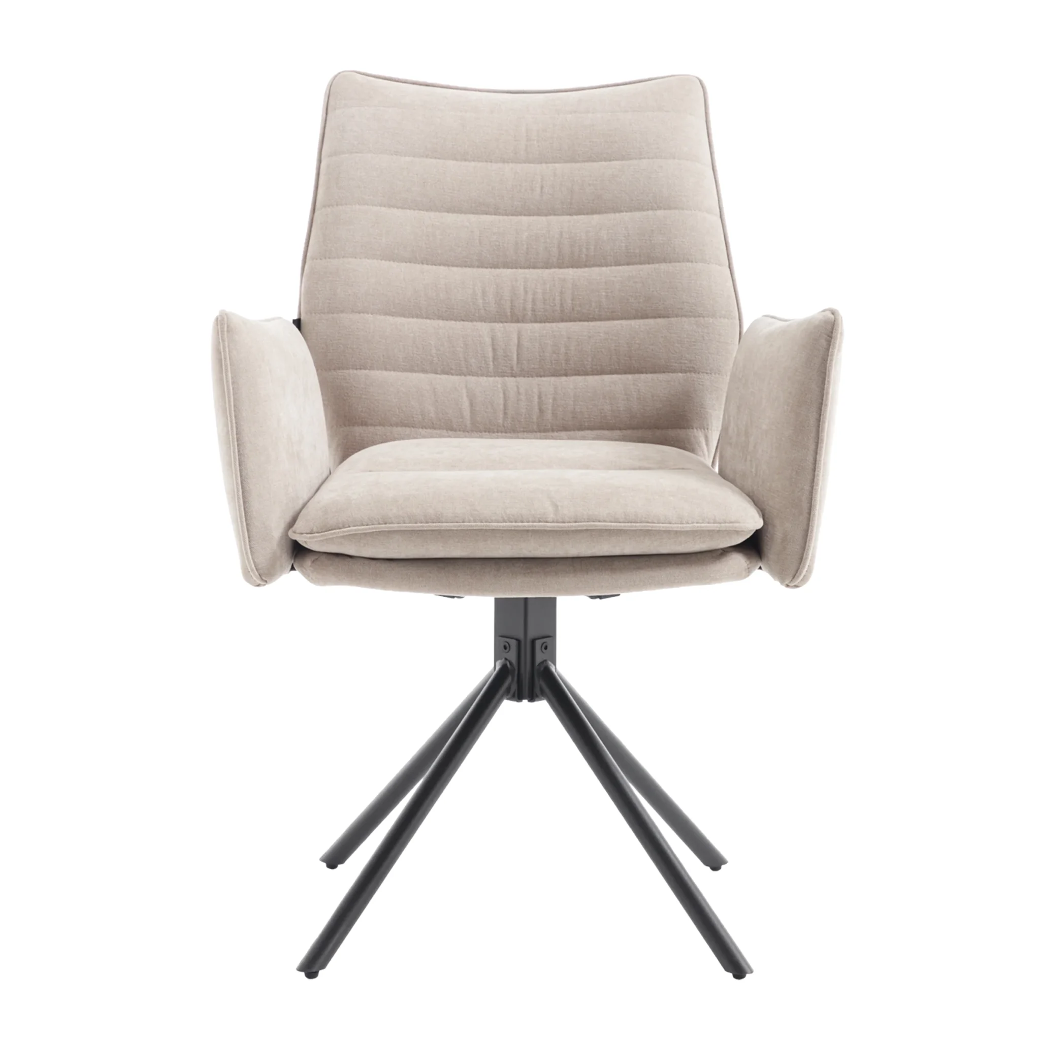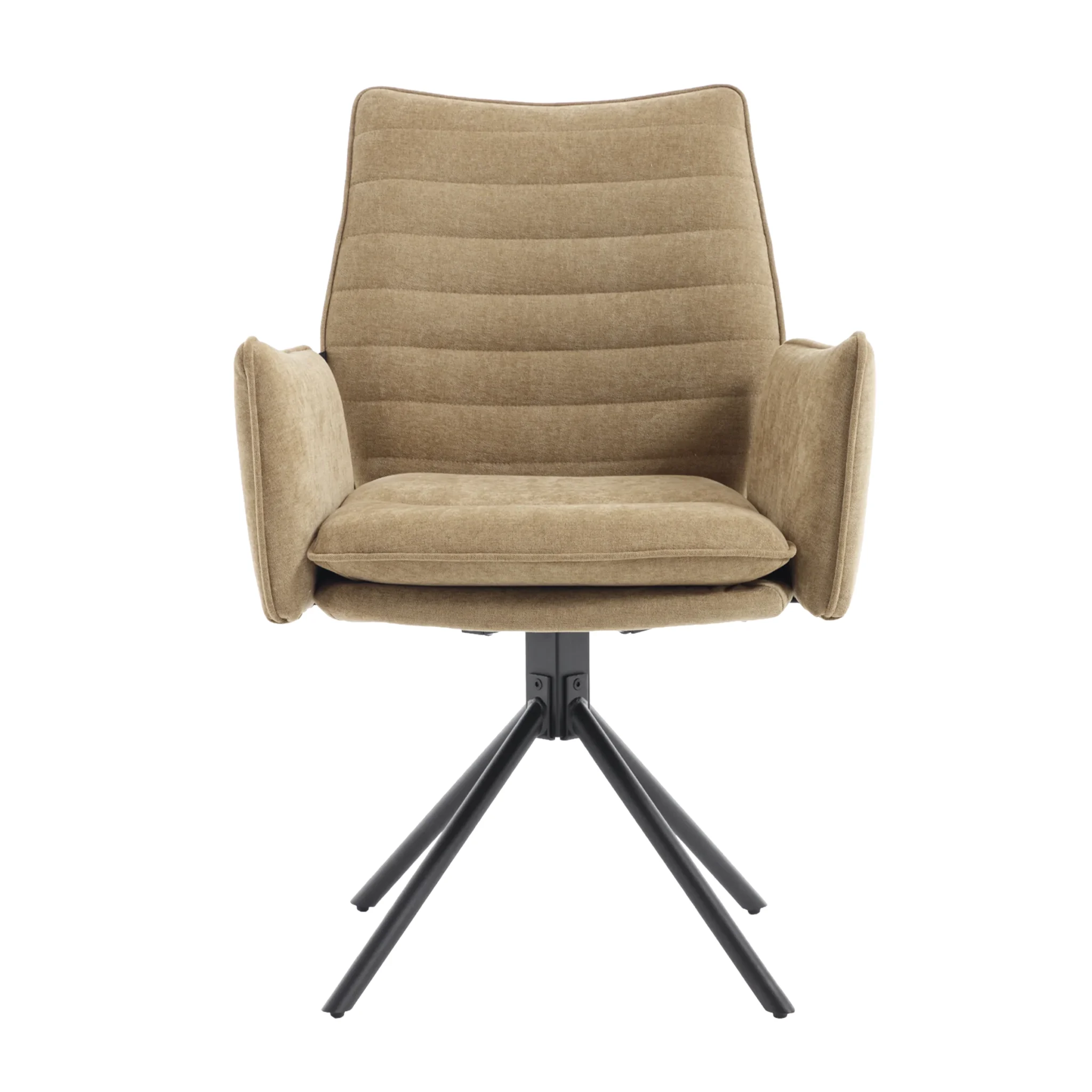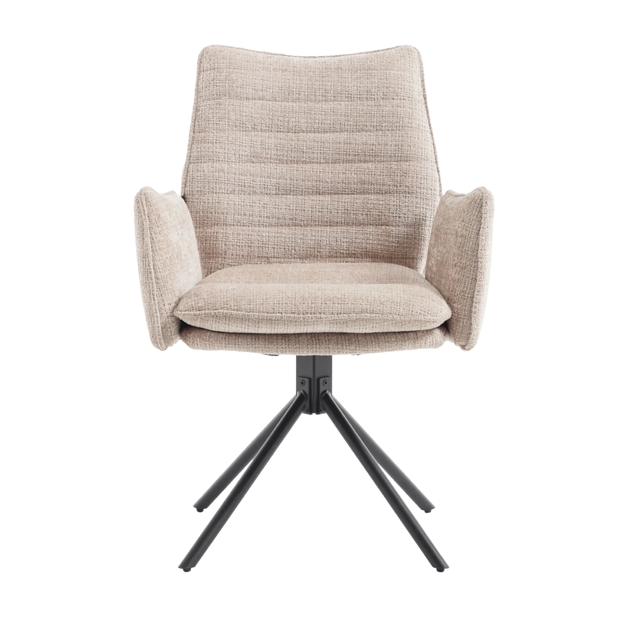 Tim is een elegante eetkamerstoel verkrijgbaar in twee luxe stoffen. De subtiele ruimte tussen rug en armleuningen zorgt voor een speels én stijlvol effect. Dankzij de 180° draaibare zitting met automatisch terugdraaisysteem draait de stoel altijd netjes terug zodra je opstaat. De stoel is verkrijgbaar in zes stijlvolle kleuren, zodat je eenvoudig een combinatie kiest die naadloos aansluit bij jouw interieur. Het stevige, gepoedercoate onderstel zorgt voor een moderne uitstraling en extra duurzaamheid.