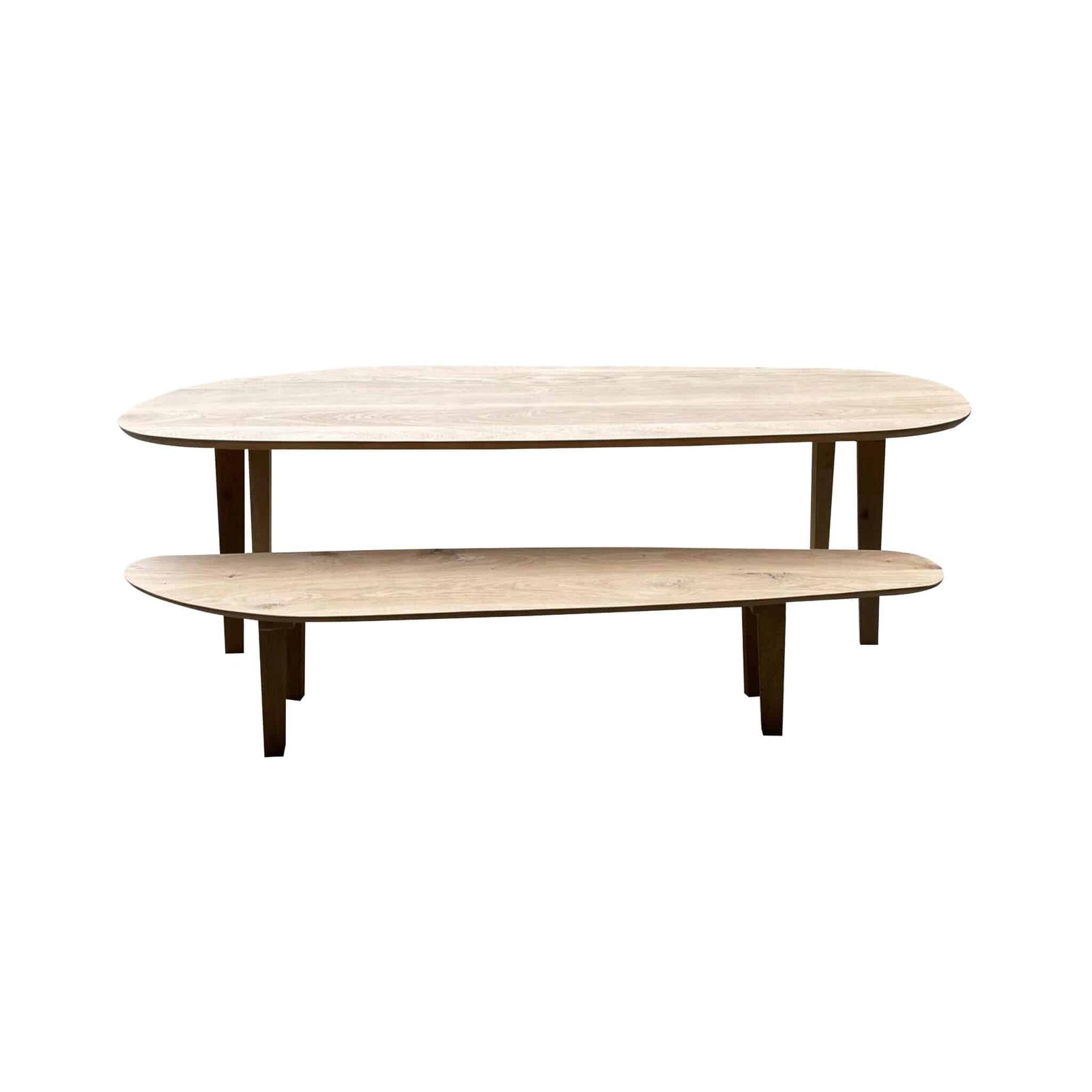 Eettafel massief eiken – vier schuinen poten – set, kiezel met bank – verjongde rand